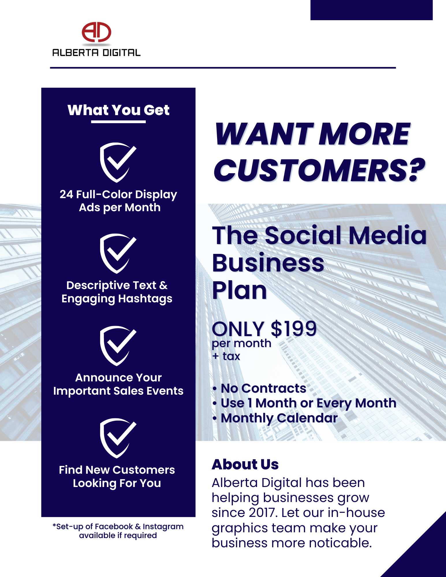 Websites are a necessity for any small or mid-size business. This also includes home-based businesses, entrepreneurs or anybody selling products and services. Even if you don’t sell anything online, a website serves as an extension of your business card. It shows information about you and your business and should detail your background and past experience. Gain instant credibility! Give your customers more confidence to buy your products and services. Start today and let Alberta Digital design the perfect website for your business!